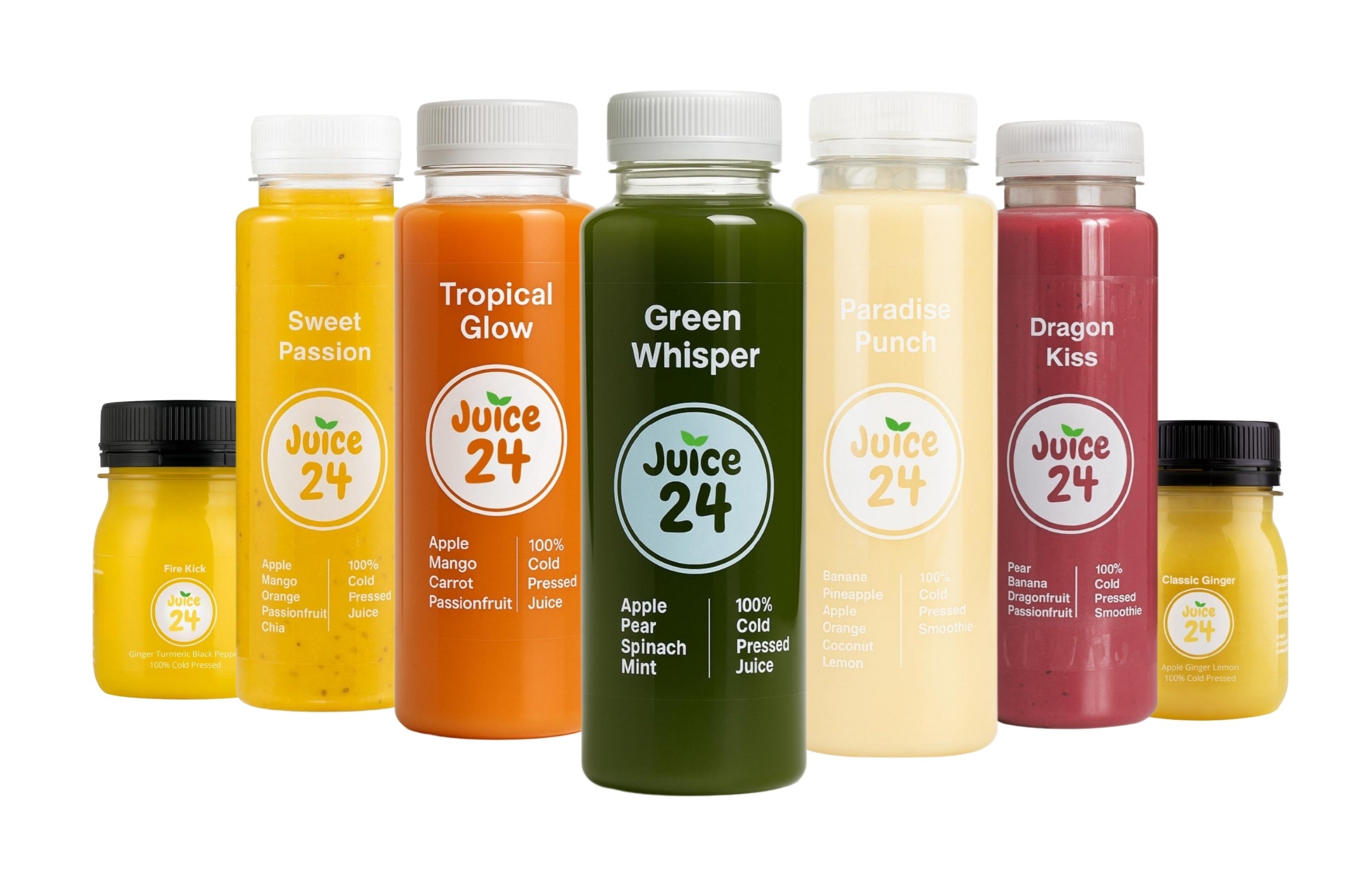 Een kleurrijke combinatie van 3 koudgeperste sapjes, 2 romige smoothies en 2 gembershots voor een natuurlijke boost vol smaak, energie en balans.